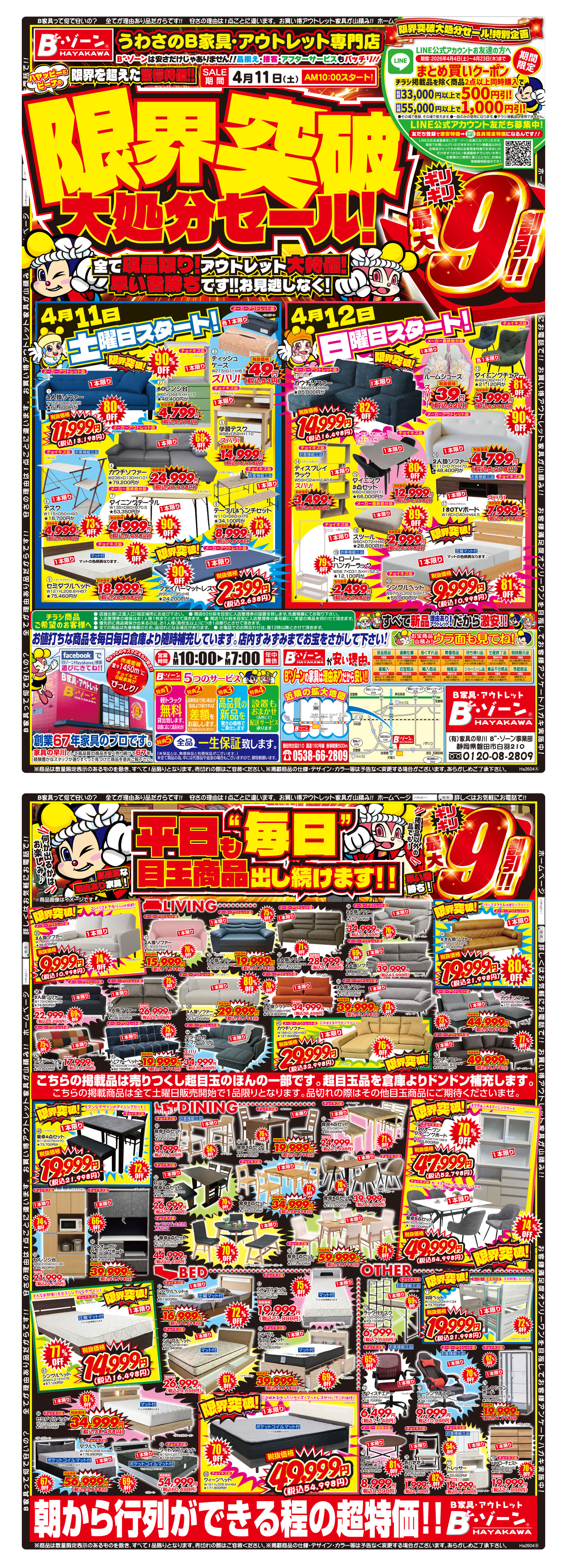 営業時間 午前10:00〜午後7:00 ■公式 YouTubeチャンネル■ チャンネル登録してB”・ゾーンのお役立ち情報をゲット! ↓ クリックして覗いてみてね!↓ ▶Bゾーンの感染防止対策はこちら◀ 新着情報 2026年4月8日 NEW! 4月11日(土)「限界突破☆大処分SALE‼︎」第2段‼開催♪ 2026年4月2日 NEW! 4月4日(土)「限界突破☆大処分SALE!」開催♪ 2026年4月2日 NEW! 【期間限定☆割引クーポンのお知らせ】 2026年3月26日 3月28日(土)「2026☆春のベッドフェアー」THEラスト!開催♪ 2026年3月19日 3月20日(金)「2026☆春のベッドフェアー」第2弾!開催♪ 2026年3月12日 3月14日(土)「2026☆春のベッドフェアー」開催♪ 2026年3月12日 【期間限定☆割引クーポンのお知らせ】 2026年3月5日 3月7日(土)「新生活大応援SALE‼」THEラスト☆開催♪ 2026年3月5日 【期間限定☆割引クーポンのお知らせ】 2026年2月26日 【期間限定☆割引クーポンのお知らせ】 Facebooktwitter